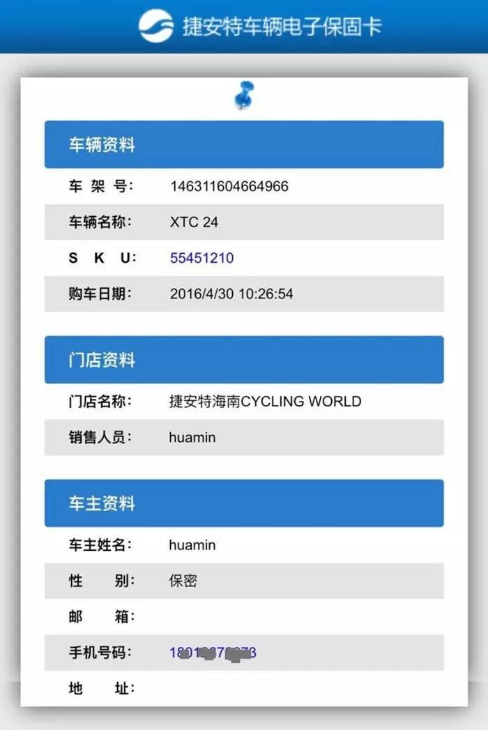只要你成功绑定QRcode车辆,成为QRcode车主。你就会获得如下捷安特车辆电子保固卡。电子保固卡将涵盖你的车辆信息,购买门店,车主资料。通过此电子保卡,你可以享受原先纸质保卡和发票一样的权利。无论你何时去门店维修、保养,无需出示任何票据,门店只需扫描QRcode,即可享受保固、维护。